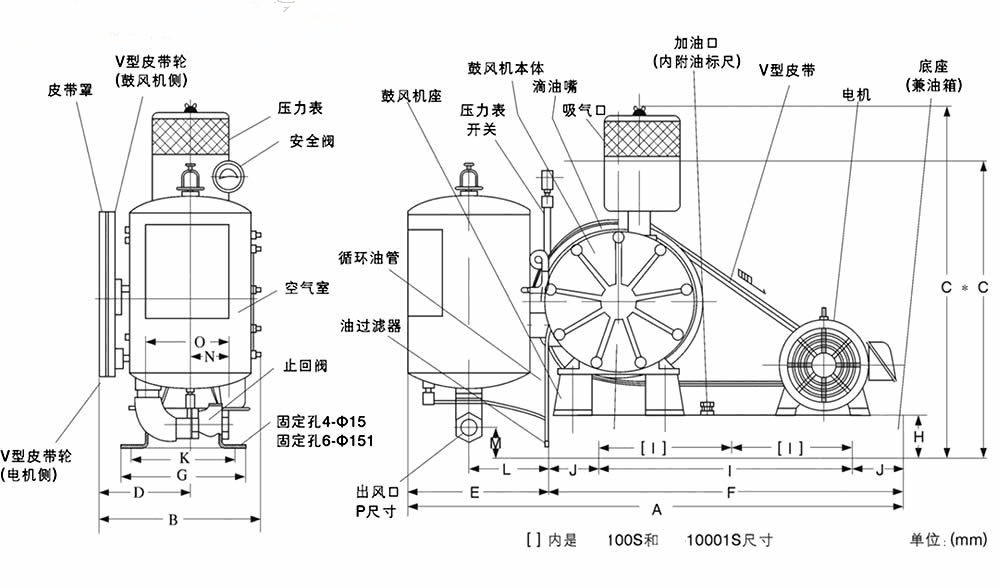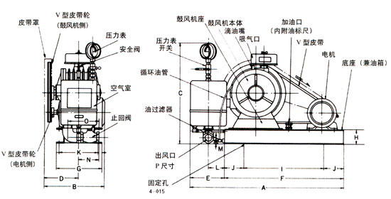 回轉(zhuǎn)式風機主要有電機、空氣過濾器、鼓風機本體、空氣室、底座(兼油箱)、滴油嘴六大部件。